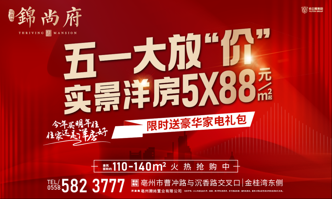 依立腾·锦尚府项目清盘特惠,洋房均价5500元/㎡,购房热线:0558-5823777。(感谢关注亳州房地产交易网)